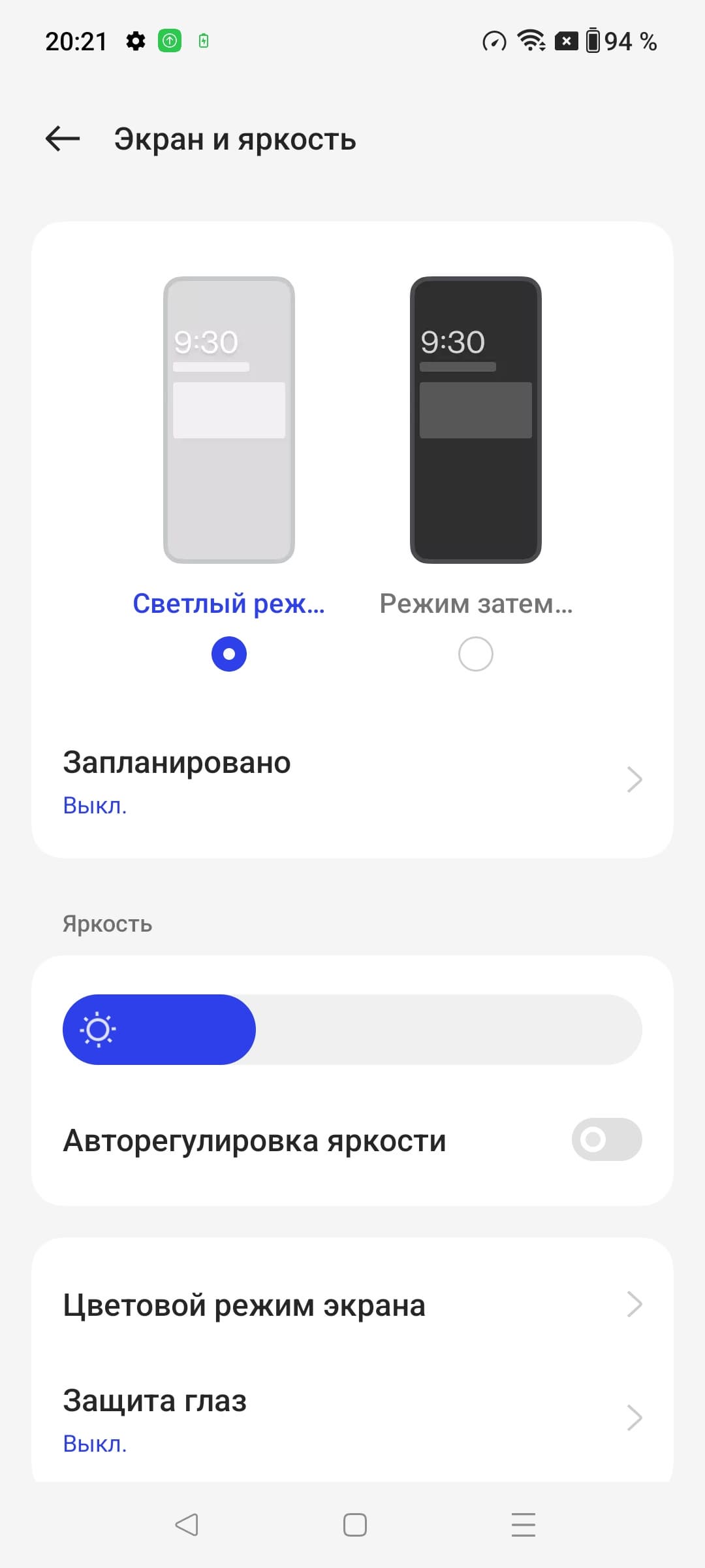 При выводе белого поля во весь экран и при ручном управлении яркостью ее максимальное значение составило 570 кд/м² в обычных условиях, а на очень ярком свету и в случае автоматической регулировки яркости оно повышается до 650 кд/м². Максимальная яркость очень высокая, поэтому, учитывая отличные антибликовые свойства, читаемость экрана даже в солнечный день вне помещения должна быть на приемлемом уровне. Минимальное значение яркости — 2 кд/м². В полной темноте яркость можно понизить до комфортного значения. В наличии автоматическая регулировка яркости по датчику освещенности (он находится справа от решетки фронтального громкоговорителя, очень близко к верхнему краю фронтальной панели). В автоматическом режиме при изменении внешних условий освещенности яркость экрана как повышается, так и понижается. Работа этой функции зависит от положения ползунка регулировки яркости: им пользователь может попытаться выставить желаемый уровень яркости в текущих условиях. Если не вмешиваться, то в полной темноте функция автояркости уменьшает яркость до 9 кд/м² (нормально, но можно и чуть выше), в условиях освещенного искусственным светом офиса (примерно 550 лк) устанавливает на 180 кд/м² (сойдет), а условно под прямыми лучами солнца повышает до 650 кд/м² (до максимума). Результат нас не совсем устроил, поэтому в полной темноте мы чуть увеличили яркость, получив в итоге для трех условий, указанных выше, следующие значения: 20, 180 и 650 кд/м² (идеальное сочетание). Получается, что функция автоподстройки яркости работает адекватно и в какой-то степени позволяет пользователю настраивать свою работу под индивидуальные требования. На любом уровне яркости значимая модуляция подсветки отсутствует, поэтому нет и никакого мерцания экрана.