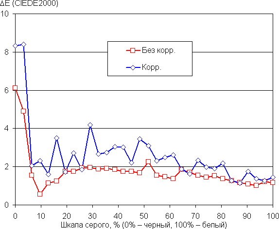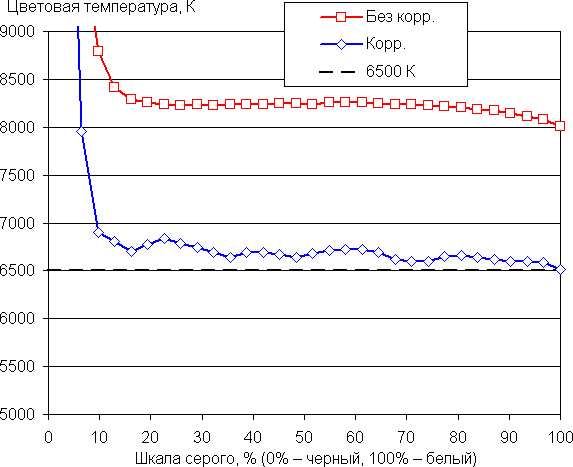 В этом устройстве есть возможность скорректировать цветовой баланс с помощью регулировки оттенка. К сожалению, при выборе профиля Естественный с охватом sRGB попытка такой коррекции приводит к неявному сбросу изменения цветового охвата — он становится таким же, как и в случае профиля Яркие цвета, то есть близким к DCI-P3. Баланс оттенков на шкале серого после выбора профиля Яркие цвета и ручной коррекции цветового баланса (ползунок — как на снимке выше) приемлемый, так как цветовая температура близка к стандартным 6500 К, и отклонение от спектра абсолютно черного тела (ΔE) ниже 10, что для потребительского устройства считается приемлемым показателем. При этом цветовая температура и ΔE мало изменяются от оттенка к оттенку — это положительно сказывается на визуальной оценке цветового баланса. (Самые темные области шкалы серого можно не учитывать, так как там баланс цветов не имеет большого значения, да и погрешность измерений цветовых характеристик на низкой яркости большая.)