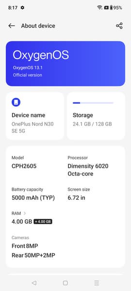 В качестве программной платформы OnePlus Nord N30 SE использует ОС Android 13 с собственной оболочкой OxygenOS 13.1. Интерфейс хорошо оптимизирован, отлично работает, лаконичен и не имеет навязчивой всплывающей рекламы. Предустановленных приложений тоже минимальное количество. Верхняя шторка не разделена на две части в зависимости от угла оттягивания. Официальный доступ к магазину и приложениям Google на месте, но имеется и собственный альтернативный магазин приложений.