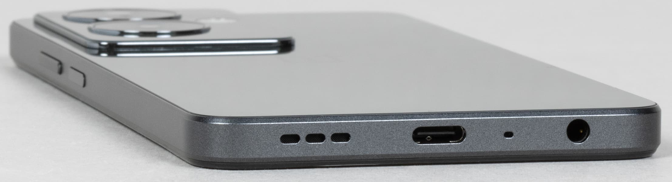 На нижнем торце установлены динамик, разговорный микрофон, разъем USB Type-C, а также 3,5-миллиметровый аудиовыход для миниджека проводных наушников.