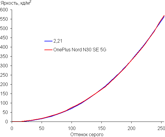 Контрастность (примерно в центре экрана) высокая — порядка 1300:1. Время отклика при переходе черный-белый-черный равно 16 мс (8 мс вкл. + 8 мс выкл.). Переход между полутонами серого 25% и 75% (по численному значению цвета) и обратно в сумме занимает 29 мс. Построенная по 32 точкам с равным интервалом по численному значению оттенка серого гамма-кривая не выявила завала ни в светах, ни в тенях. Показатель аппроксимирующей степенной функции равен 2,21, что очень близко к стандартному значению 2,2. При этом реальная гамма-кривая мало отклоняется от степенной зависимости: