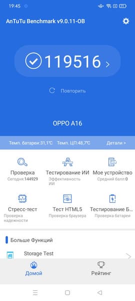 В качестве программной платформы Oppo A16 использует ОС Android 11 с собственной оболочкой ColorOS 11.1. Интерфейс не тормозит, но и плавности не чувствуется, есть ощущение резких переходов при перелистывании экранов. К организации и количеству настроек претензий нет. Ввиду наметившегося разделения фирменных оболочек на два «лагеря» стоит отметить, что в ColorOS 11.1 при смахивании сверху с любого места открывается одна и та же общая панель, содержащая и быстрые настройки, и уведомления. Есть игровой и детский режимы, навязчивой рекламы нет. На месте официальный магазин приложений Google Play и сервисы Google.