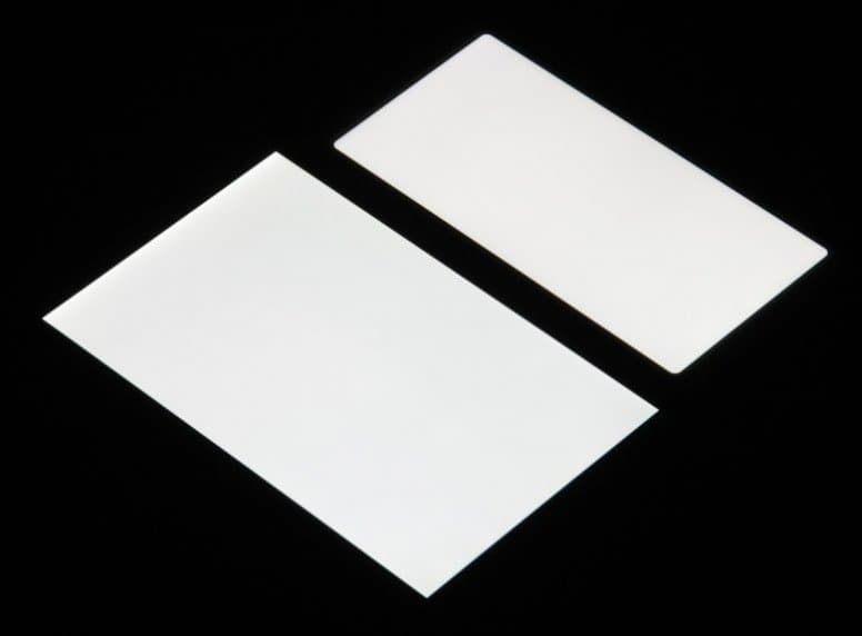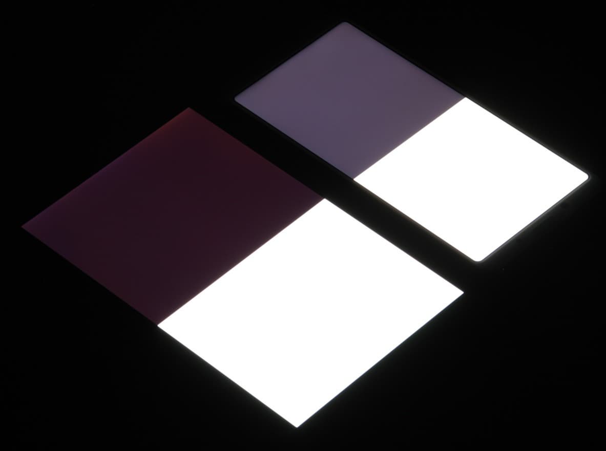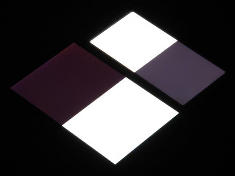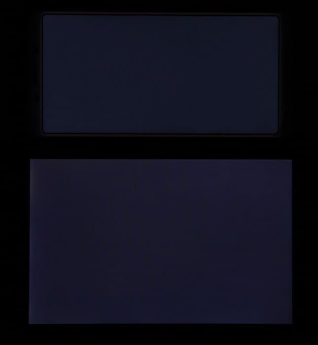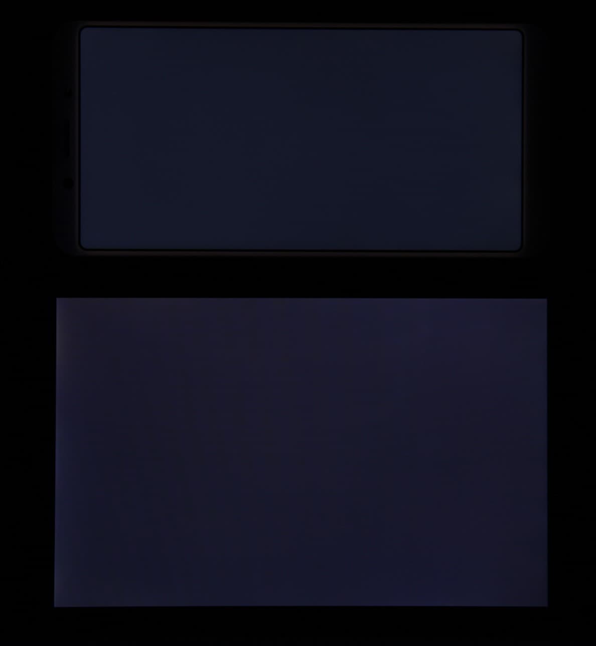 Яркость под углом у экранов сильно уменьшилась, но в случае Oppo F5 снижение яркости чуть-чуть больше. Черное поле при отклонении по диагонали высветляется очень сильно и приобретает фиолетовый оттенок. Фотографии ниже это демонстрируют (яркость белых участков в перпендикулярном плоскости экранов направлении одинаковая!):