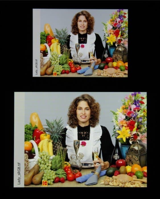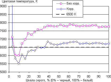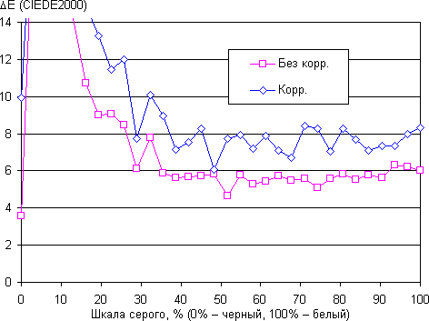Баланс оттенков на шкале серого средний, так как цветовая температура на большей части шкалы серого существенно выше стандартных 6500 К, да и отклонение от спектра абсолютно черного тела (ΔE) в темной области выше 10. При этом цветовая температура и ΔE заметно изменяются от оттенка к оттенку — это отрицательно сказывается на визуальной оценке цветового баланса. (Самые темные области шкалы серого можно не учитывать, так как там баланс цветов не имеет большого значения, да и погрешность измерений цветовых характеристик на низкой яркости большая.) Коррекция (как указано на снимке с экрана выше) немного улучшила ситуацию с цветовой температурой, но ΔE возросла: