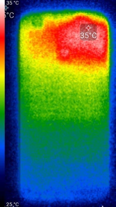 Нагрев локализован в верхней части аппарата ближе к левому краю, что, видимо, соответствует расположению микросхемы SoC. По данным теплокамеры, максимальный нагрев составил 35 градусов (при температуре окружающего воздуха в 24 градуса), это относительно немного.