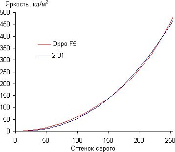 Контрастность (примерно в центре экрана) высокая — порядка 1500:1. Время отклика при переходе черный-белый-черный равно 32 мс (16 мс вкл. + 16 мс выкл.). Переход между полутонами серого 25% и 75% (по численному значению цвета) и обратно в сумме занимает 50 мс. Построенная по 32 точкам с равным интервалом по численному значению оттенка серого гамма-кривая не выявила завала ни в светах, ни в тенях. Показатель аппроксимирующей степенной функции равен 2,31, что немного выше стандартного значения 2,2. При этом реальная гамма-кривая слегка отклоняется от степенной зависимости: