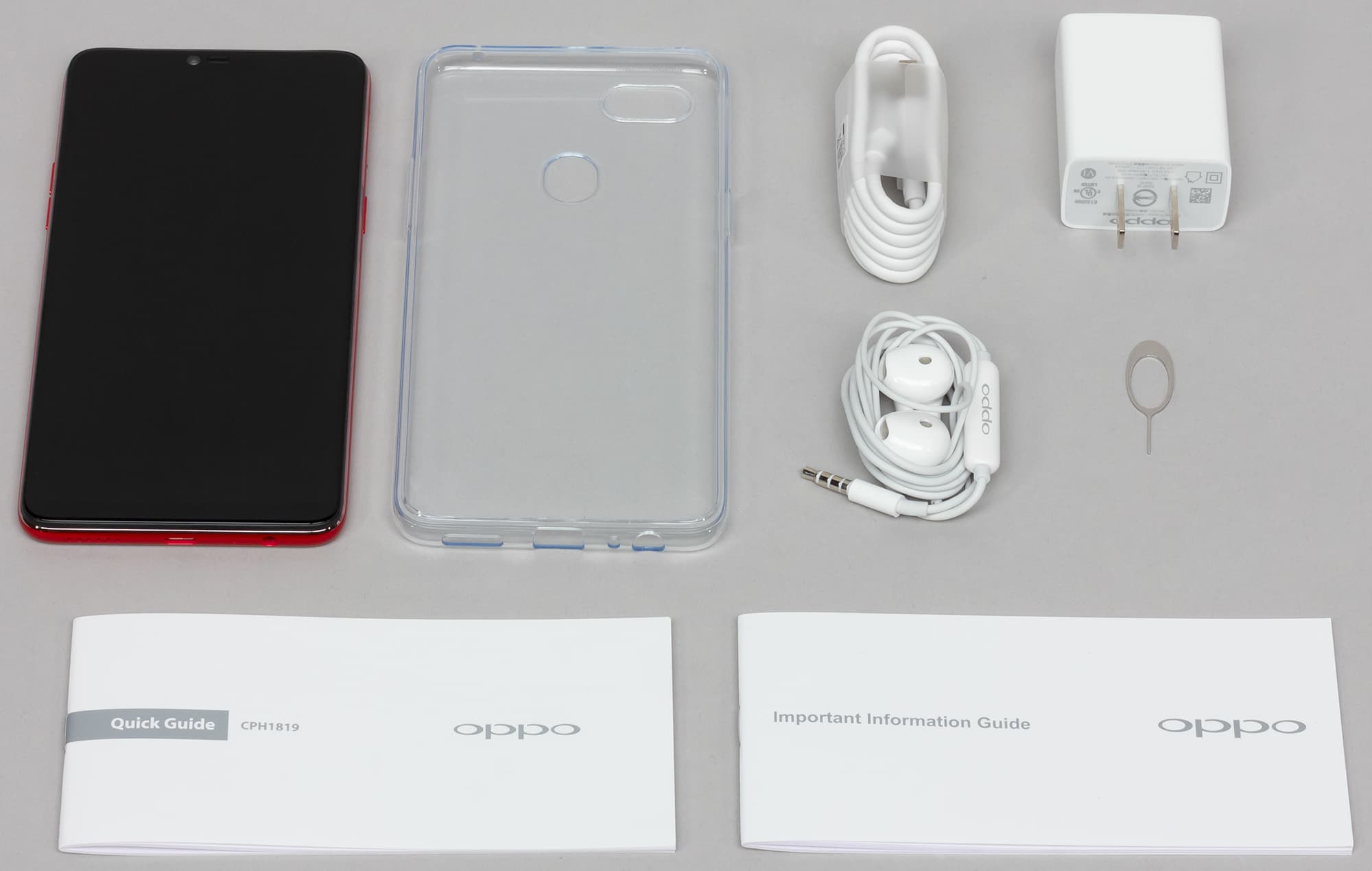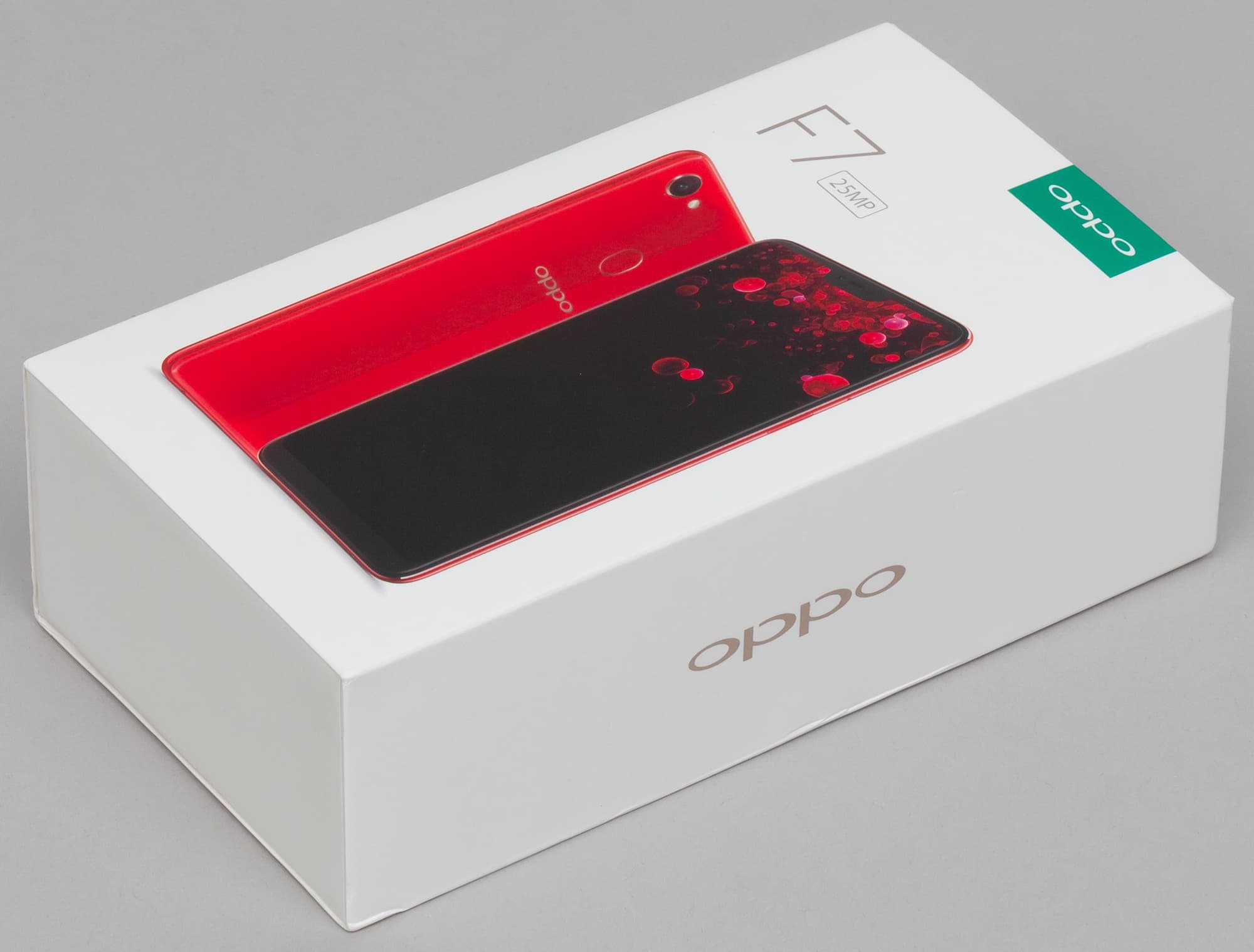 Комплектацию Oppo F7 можно назвать как минимум расширенной: смартфон поставляется в комплекте с USB-кабелем, сетевым адаптером (5 В; 2 А), проводной стереогарнитурой, прозрачным чехлом и ключиком для извлечения карт.