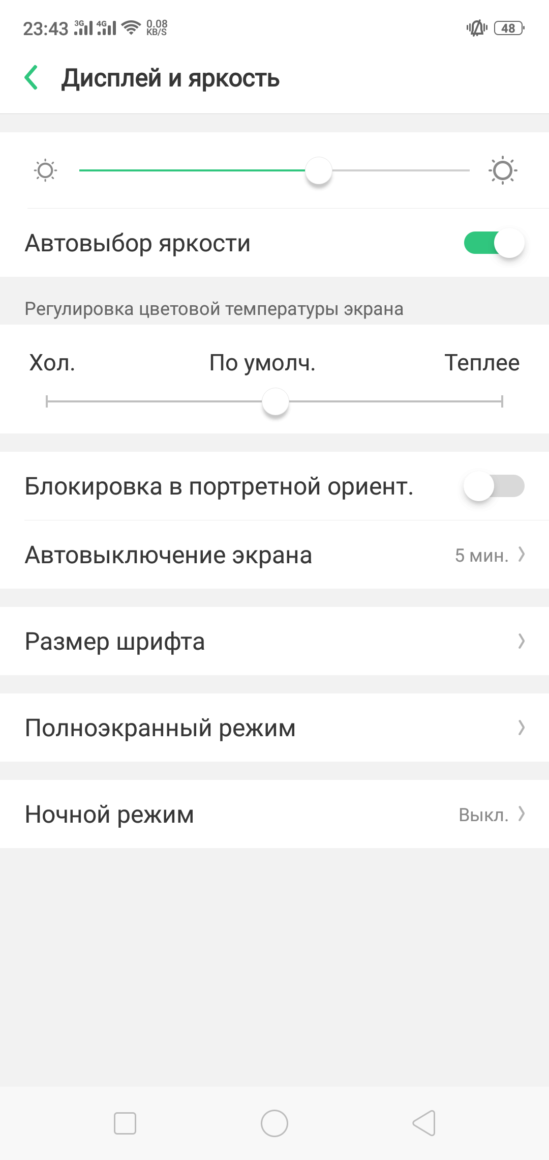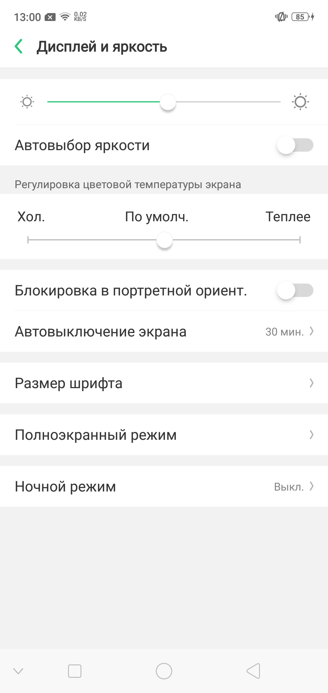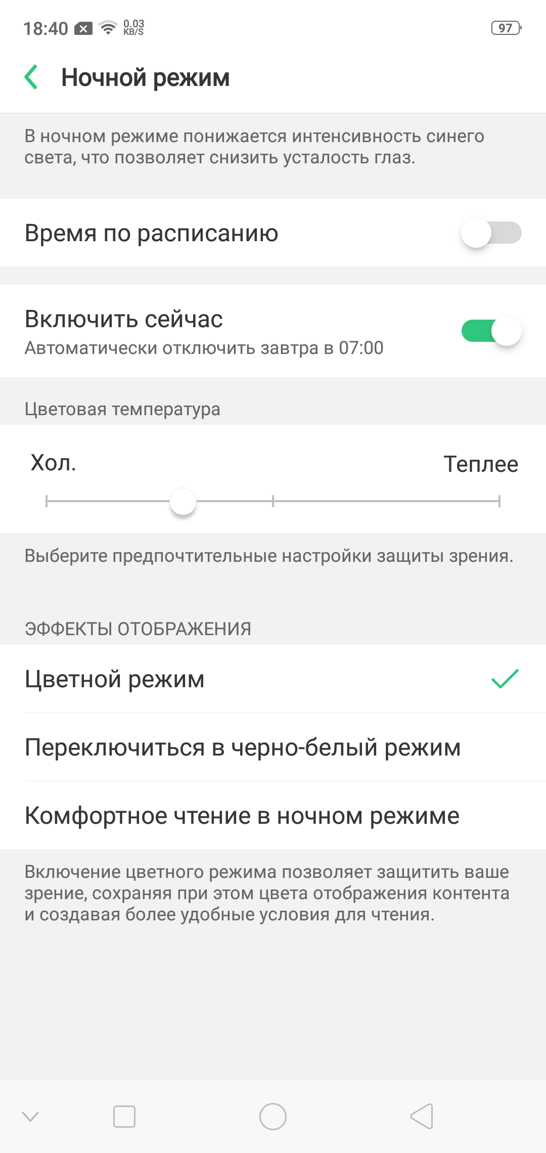Но диапазона данной регулировки не хватает для достижения значения в 6500 К. Спасает регулировка на странице Ночной режим: