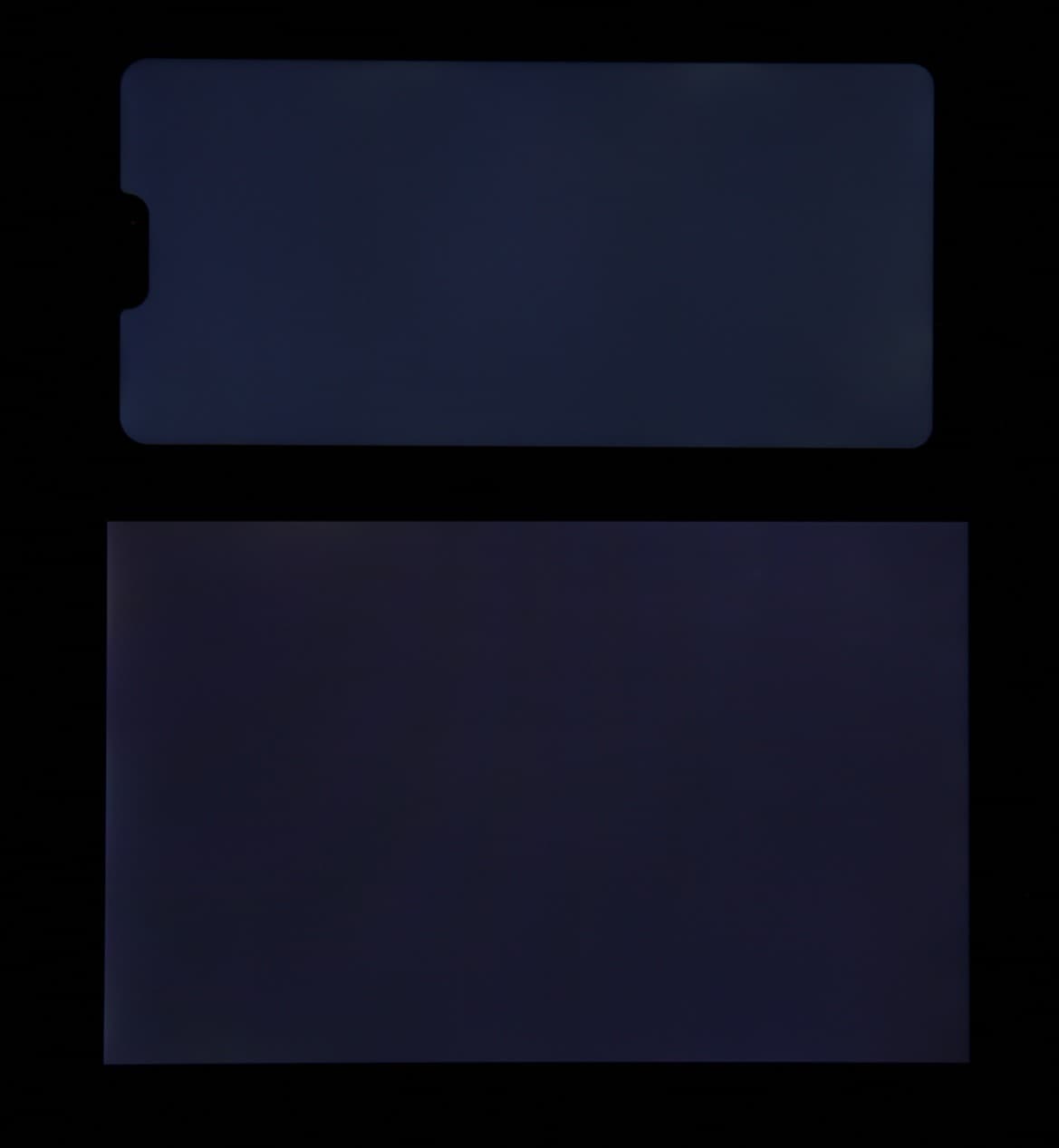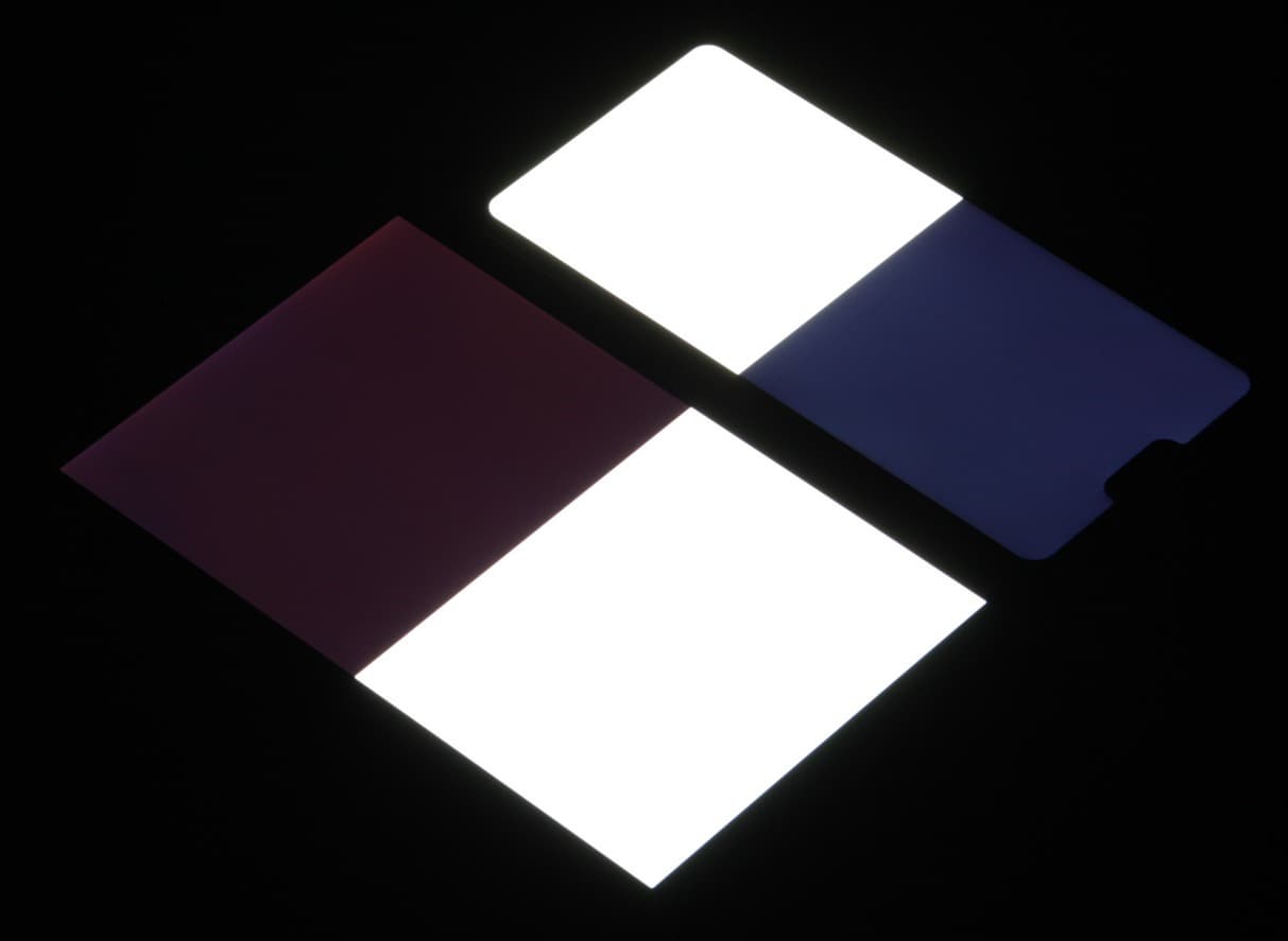 Яркость под углом у экранов уменьшилась (как минимум в 4 раза, исходя из разницы в выдержке), но в случае Oppo F7 падение яркости меньше. Черное поле при отклонении по диагонали высветляется в средней степени и приобретает фиолетовый оттенок. Фотографии ниже это демонстрируют (яркость белых участков в перпендикулярном плоскости экранов направлении одинаковая!):