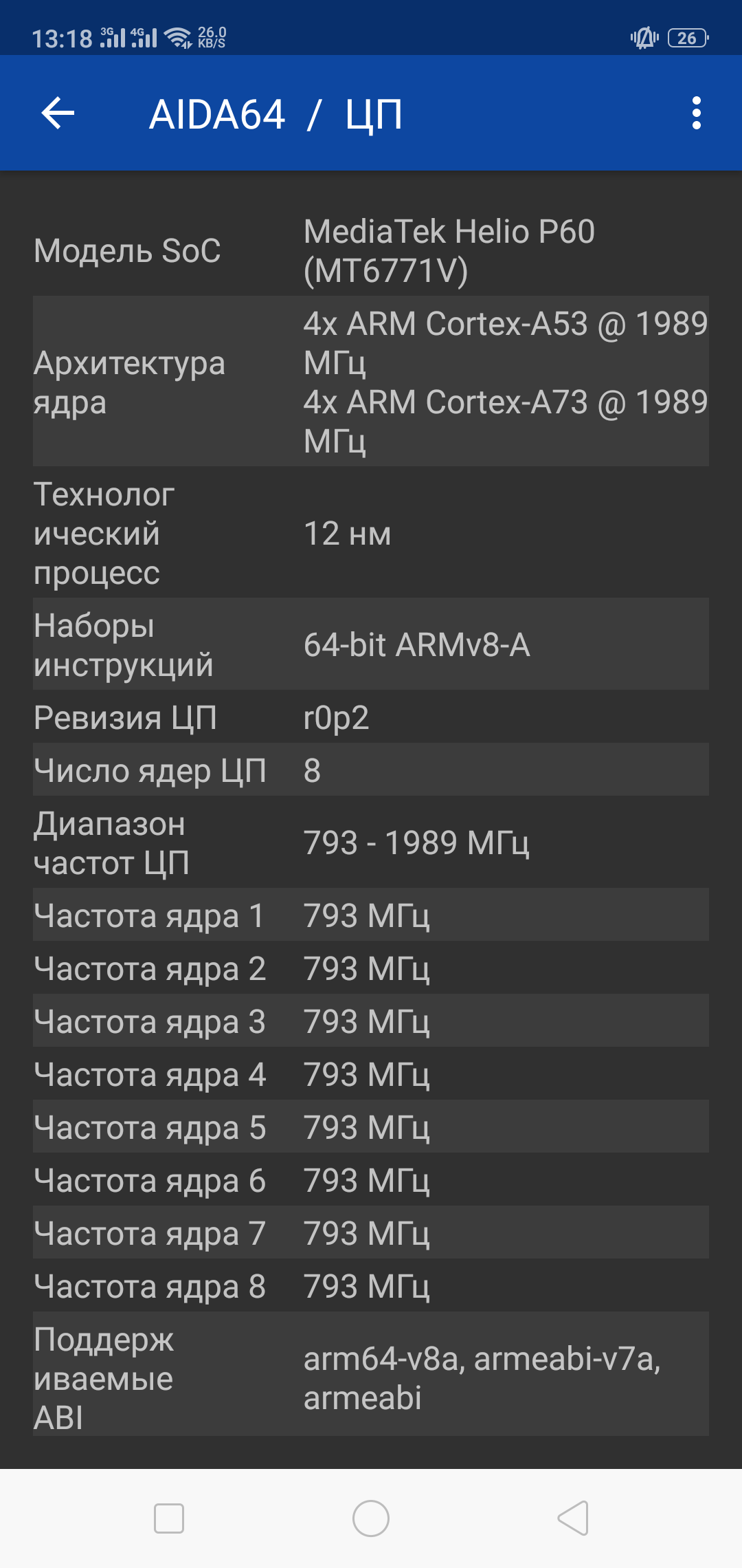 - SoC MediaTek Helio P60, 8 ядер (4×Cortex-A53 @2,0 ГГц + 4×Cortex-A73 @2,0 ГГц)