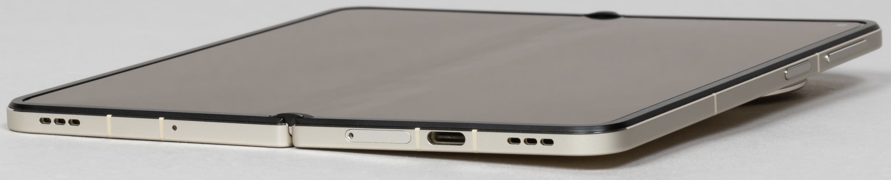 Лицевая поверхность большого основного раскладывающегося экрана выполнена из пластика. Тем не менее, его поверхность относительно устойчива к появлению царапин, по крайней мере, поцарапать его ногтем не получилось. Поверхность этого гибкого экрана глянцевая и слегка неровная по всей площади, а в месте сгиба есть выраженная складка. Впрочем, это практически никак не сказывается на изображении, если смотреть на экран более-менее перпендикулярно к его поверхности. На этот экран наклеена защитная пленка, удаление которой запрещено, то есть она является частью экрана (пленка, правда, чуть меньше области отображения, что смотрится не очень аккуратно). Внешняя поверхность дополнительного экрана — это стеклянная пластина с зеркально-гладкой поверхностью. Судя по отражению объектов, антибликовые свойства основного экрана гораздо лучше, а дополнительного немного лучше, чем у экрана Google Nexus 7 (2013) (далее просто Nexus 7). Двоение отраженных объектов в экранах очень слабое, это свидетельствует о том, что между слоями экрана нет воздушного промежутка. За счет меньшего числа границ (типа стекло/воздух) с сильно различающимися коэффициентами преломления экраны без воздушного промежутка лучше смотрятся в условиях интенсивной внешней засветки. На внешней поверхности дополнительного экрана есть специальное олеофобное (жироотталкивающее) покрытие (эффективное, лучше, чем у Nexus 7), а пленка на основном экране, видимо, сама обладает такими свойствами, поэтому следы от пальцев удаляются существенно легче, а появляются с меньшей скоростью, чем в случае обычного стекла.