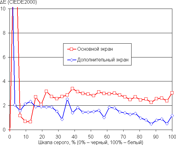 (Самые темные области шкалы серого в большинстве случаев можно не учитывать, так как там баланс цветов не имеет большого значения, да и погрешность измерений цветовых характеристик на низкой яркости высокая.)