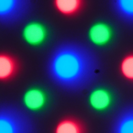 В обоих экранах используется матрица Super AMOLED — активная матрица на органических светодиодах. Полноцветное изображение создается с помощью субпикселей трех цветов — красного (R), зеленого (G) и синего (B), но красных и синих субпикселей в два раза меньше, что можно обозначить как RGBG. Это подтверждается фрагментом микрофотографии: