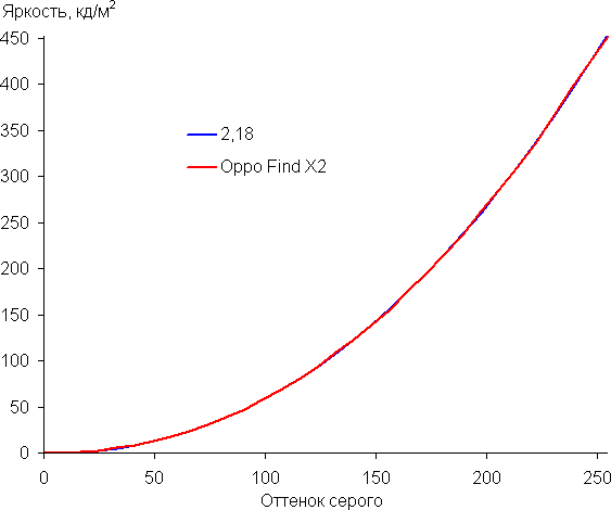 Напомним, что в случае OLED-экранов яркость фрагментов изображения динамично меняется в соответствии с характером выводимого изображения — немного уменьшается для светлых в целом изображений. В итоге полученная зависимость яркости от оттенка (гамма-кривая), скорее всего, не соответствует гамма-кривой статичного изображения, так как измерения проводились при последовательном выводе оттенков серого почти на весь экран.