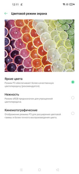 Также есть Режим естественных оттенков, в котором, судя по описанию, должна выполнятся автоматическая подстройка цветового баланса под условия внешнего освещения. Мы его включили и поместили смартфон сначала под светодиодные светильники с холодным белым светом, получив в итоге значения 1,4 для ΔE и 6900 К для цветовой температуры, а потом под галогеновую лампу накаливания (теплый свет), получив 1,5 и 5360 К соответственно. Таким образом, цветовая температура стала ниже, то есть функция работает так, как ожидалось. Отметим, что сейчас сложившимся стандартом является калибровка устройств отображения к точке белого в 6500 К, но в принципе, коррекция под цветовую температуру внешнего света может принести пользу, если хочется добиться лучшего соответствия изображения на экране тому, что видно на бумаге (или на любом носителе, на котором цвета формируются за счет отражения падающего света) в текущих условиях.