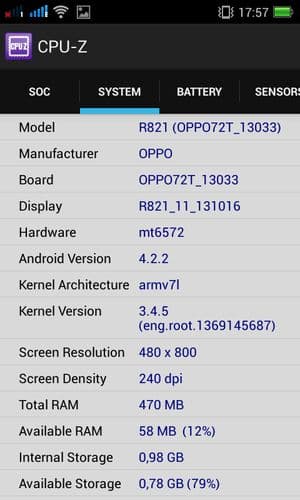 Аппаратная платформа Oppo Muse строится на базе не слишком мощной однокристальной системы (SoC) производства тайваньской MediaTek — MT6572, на текущий момент по производительности являющейся платформой начального уровня, предназначенной для устройств бюджетного ценового сегмента. Центральный процессор здесь имеет лишь 2 ядра Cortex-A7, работающих на частоте 1,2 ГГц. Помощь в обработке графики ему оказывает ветхий видеопроцессор Mali-400 MP. Оперативной памяти в устройстве предусмотрено 512 МБ, что уже по современным меркам маловато, и не соответствует комфортному обращению с устройством, без необходимости экономить и постоянно следить за чисткой висящих в памяти последних открытых программ. Объем встроенного флэш-массива в устройстве номинально составляет 2,5 ГБ, но в реальности для пользовательских нужд остается около 1,5 ГБ, так что без вставленной карты памяти аппарат практически бесполезен. Карты памяти смартфон поддерживает емкостью до 32 ГБ (но наша проверочная карточка SanDisk Ultra MicroSD XC I на 64 ГБ уверенно распозналась, это отображено на скриншоте). А вот режим подключения внешних устройств к порту USB (USB Host, USB OTG) здесь не поддерживается. Естественно, нет и MHL.