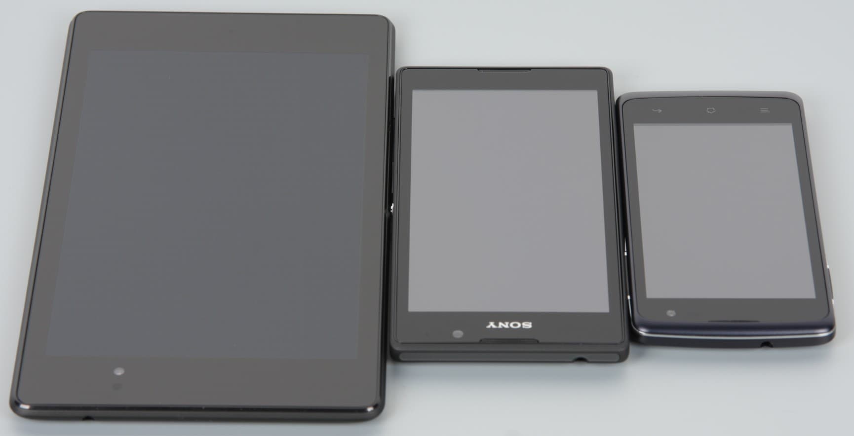 Лицевая поверхность экрана выполнена в виде стеклянной пластины с зеркально-гладкой поверхностью, устойчивой к появлению царапин. Судя по отражению объектов, имеется какой-то антибликовый фильтр, который по снижению яркости отражения заметно хуже, чем у Google Nexus 7 (2013) (далее мы сравниваем именно с ним). Поверхность самой матрицы под стеклом едва матовая, поэтому экран отражает как прямые источники света (внешней поверхностью), так и частично рассеянный свет (поверхностью матрицы), это уменьшает читаемость в условиях сильной внешней засветки. Для наглядности приведем фотографии, на которых в выключенных экранах трех устройств отражается белая поверхность (слева — Nexus 7, справа — Oppo Find Muse R821, в центре — Sony Xperia C, далее их можно различать по размеру):