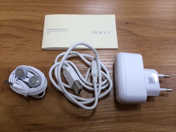 Смартфон поступает в продажу в очень маленькой по размерам картонной коробке стандартной прямоугольной формы без каких-либо необычных элементов конструкции или дополнительных украшений, как это бывает у упаковок более дорогих моделей Oppo. Здесь все привычно: крышка из толстого картона прикрывает несколько отделений различного размера, содержащих зарядное устройство (выходной ток 1 А), соединительный кабель USB—Micro-USB, проводную гарнитуру с наушниками обычного, не вакуумного типа и небольшую бумажную книжицу. Учитывая еще и сам смартфон, становится даже немного удивительно, как все это уместилось в столь маленькую коробочку.