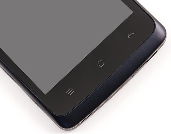 Прямо в стекле вырезано отверстие для выхода звука из разговорного динамика, рядом под ним виднеются глазки фронтальной камеры и сенсорных датчиков. Ниже под экраном в ряд расположены три сенсорных аппаратных кнопки управления системой и приложениями. Кнопки имеют аккуратные пиктограммы и достаточно неяркую подсветку мягкого голубоватого оттенка.