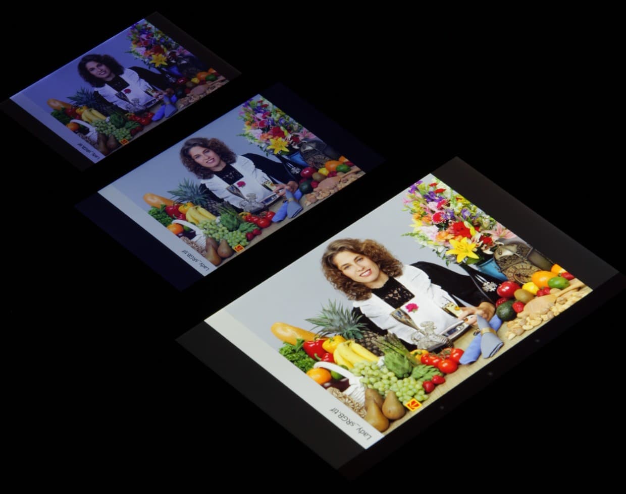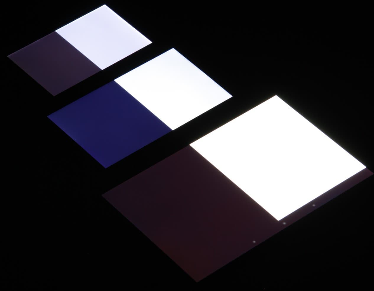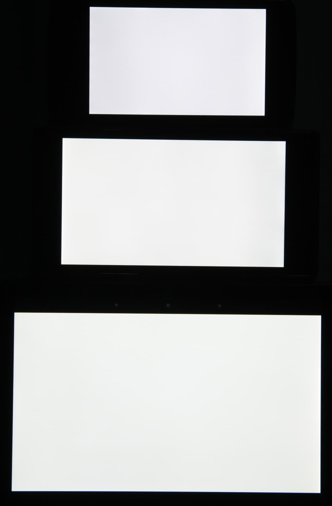 Микрофотографии немного размыты из-за слегка матовой поверхности матрицы. Экран имеет хорошие углы обзора без значительного сдвига цветов и без инвертирования оттенков (кроме самых темных при отклонении взгляда вправо) даже при больших отклонениях от перпендикуляра к экрану. Для сравнения приведем фотографии, на которых на экраны тех же трех устройств выведены одинаковые изображения, при этом яркость экранов установлена примерно на 200 кд/м². Перпендикулярно к экранам тестовая картинка: