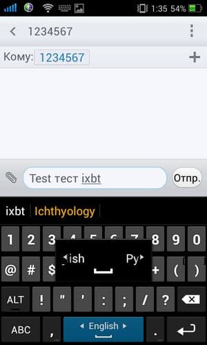 Зависаний, самопроизвольных перезагрузок/выключений смартфона или других проблем за время нашего тестирования не наблюдалось, за исключением описанной проблемы с невозможностью обновления текущей прошивки. При поднесении к уху экран блокируется датчиком приближения. Раскладка и расположение кнопок у штатной клавиатуры не самое удобное: переключение языков здесь осуществляется скользящим движением вбок по пробелу, выделенного верхнего ряда с цифрами здесь нет, нужно все время переключать раскладку с букв на цифры и обратно.