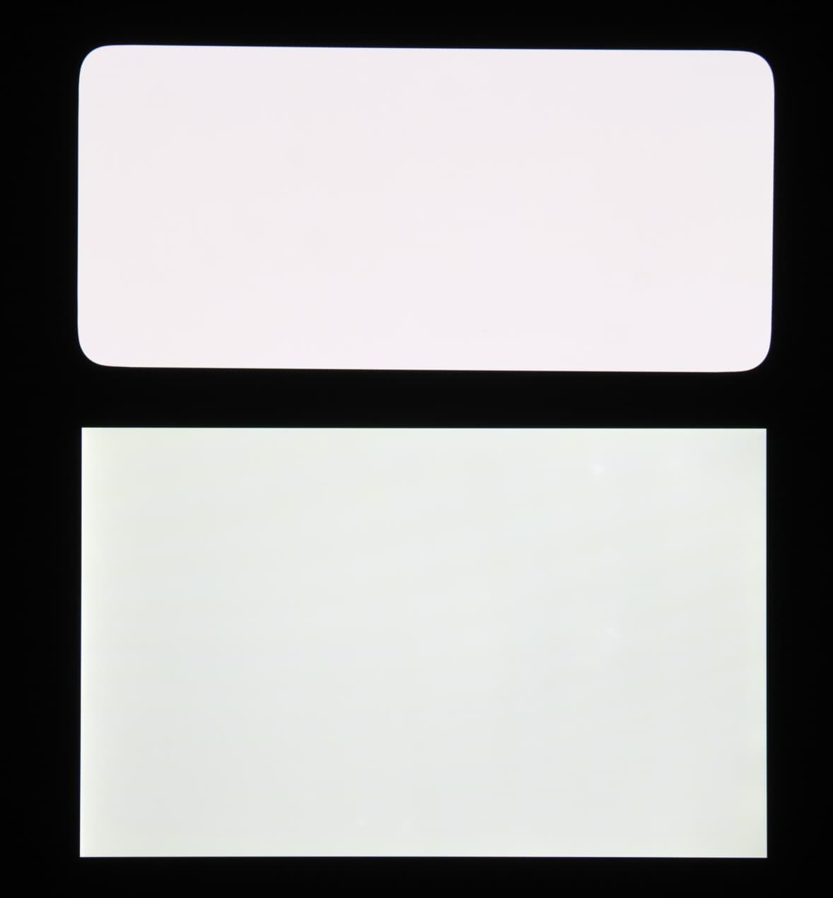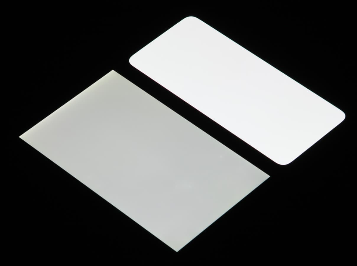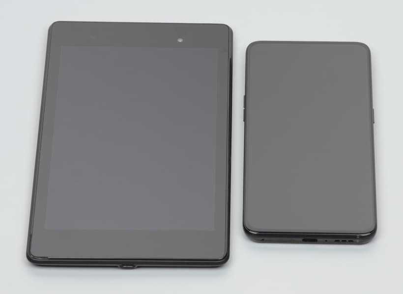Лицевая поверхность экрана выполнена в виде стеклянной пластины с зеркально-гладкой поверхностью, устойчивой к появлению царапин. Судя по отражению объектов, антибликовые свойства экрана не хуже, чем у экрана Google Nexus 7 (2013) (далее просто Nexus 7). Для наглядности приведем фотографию, на которой в выключенных экранах отражается белая поверхность (слева — Nexus 7, справа — Oppo Reno Z, далее их можно различать по соотношению сторон экрана):