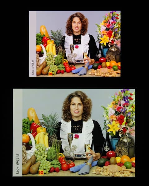 Цвета на экране Oppo Reno перенасыщены (обратите внимание на помидоры, бананы, салфетку и оттенок лица), а цветовой баланс немного отличается. Напомним, что фотография не может служить надежным источником сведений о качестве цветопередачи и приводится только для условной наглядной иллюстрации. В частности, выраженный красноватый оттенок белого и серого полей, присутствующий на фотографиях экрана Oppo Reno, при перпендикулярном взгляде визуально отсутствует, что подтверждается аппаратными тестами с помощью спектрофотометра. Причина в том, что спектральная чувствительность матрицы фотоаппарата неточно совпадает с этой характеристикой человеческого зрения.