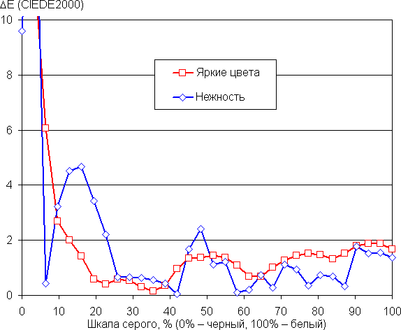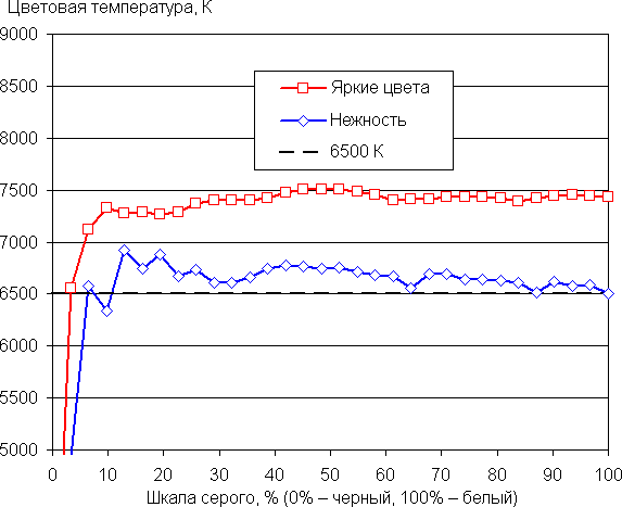 После коррекции как на снимке выше баланс оттенков на шкале серого хороший, поскольку цветовая температура блика к стандартным 6500 К, а отклонение от спектра абсолютно черного тела (ΔE) ниже 10, что для потребительского устройства считается неплохим показателем (графики на рисунках ниже, подписанные как Нежность). При этом цветовая температура мало изменяется от оттенка к оттенку — это положительно сказывается на визуальной оценке цветового баланса. Впрочем, по умолчанию цветовая температура выше, но не критично, а разброс ΔE даже ниже (графики — Яркие цвета). Поэтому выполнять коррекцию смысла нет, достаточно просто выбрать профиль Нежность, чтобы обеспечить естественную насыщенность цветов. (Самые темные области шкалы серого можно не учитывать, так как там баланс цветов не имеет большого значения, да и погрешность измерений цветовых характеристик на низкой яркости большая.)