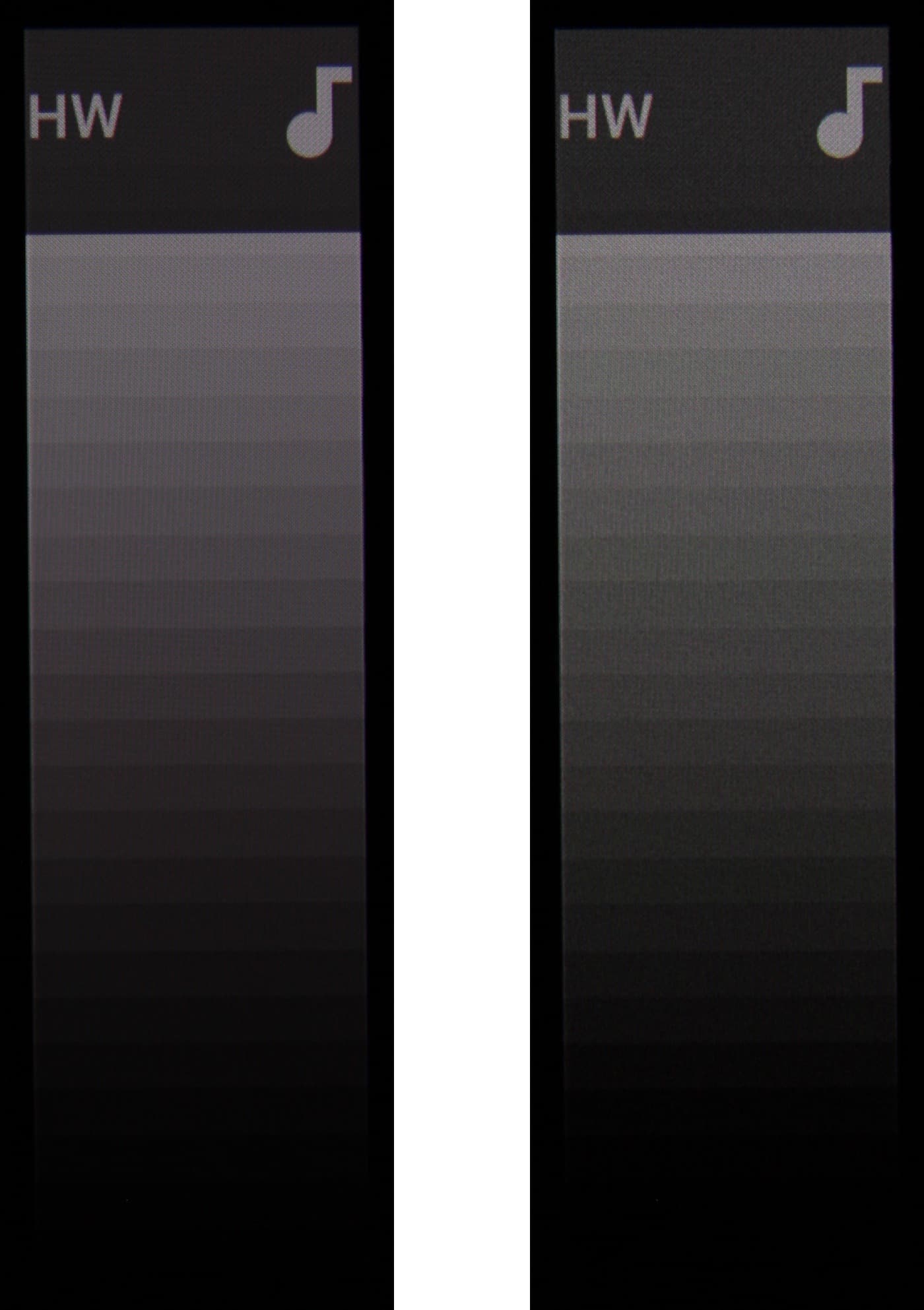 Проверим утверждения насчет возможного увеличения шума. Ожидать его можно только на очень низкой яркости. Действительно, снимки экрана на низкой яркости показывают какое-то увеличение зашумления картинки (при этом статическое). На коллаже ниже слева фрагмент градиента с выключенной функцией DC Dimming, а справа — с включенной: