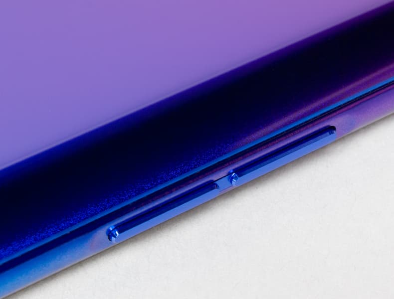 В случае фиолетового окраса корпус имеет градиентный переход к синему. Поверхность задней стенки гладкая и скользкая, однако выглядит она, словно матовая. У нее нет зеркального блеска, больше похоже на шлифованный металл, и это красиво.
