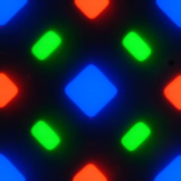 В этом экране используется матрица Super AMOLED — активная матрица на органических светодиодах. Полноцветное изображение создается с помощью субпикселей трех цветов — красного (R), зеленого (G) и синего (B), но красных и синих субпикселей в два раза меньше, что можно обозначить как RGBG. Это подтверждается фрагментом микрофотографии: