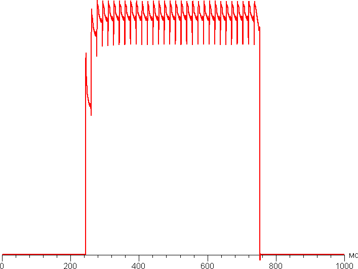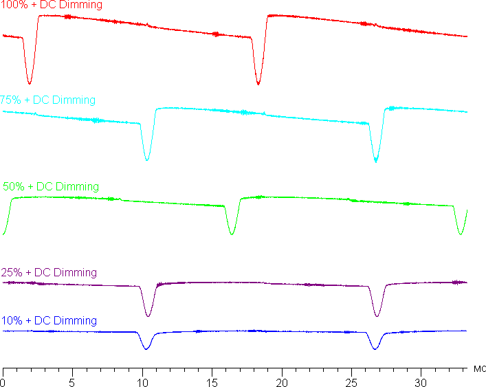 На любом уровне яркости присутствует значимая модуляция с частотой чуть больше 60 или 240 Гц. На рисунке ниже приведены зависимости яркости (вертикальная ось) от времени (горизонтальная ось) для нескольких значений настройки яркости: