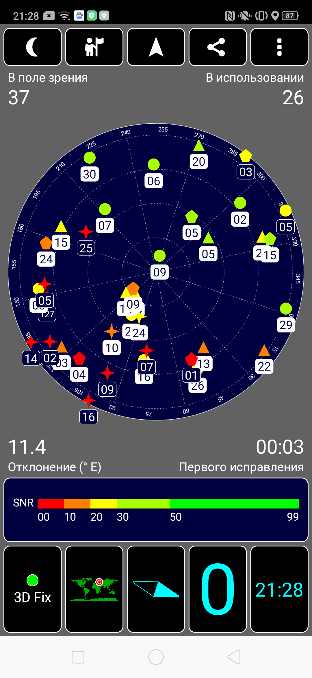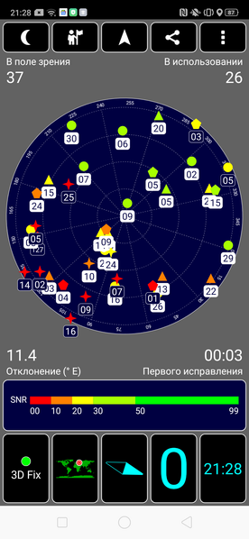Навигационный модуль работает с GPS (с A-GPS), с отечественной Глонасс, с китайской Beidou и с европейской Галилео. Первые спутники даже при холодном старте обнаруживаются быстро, точность позиционирования не вызывает претензий.