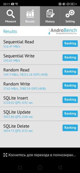 Результаты теста AndroBench на скорость работы с памятью:
