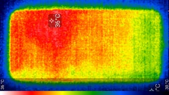 Нагрев больше в верхней левой части аппарата, что, видимо, соответствует расположению микросхемы SoC. По данным теплокамеры, максимальный нагрев составил всего 36 градусов (при температуре окружающего воздуха в 24 градуса), это относительно немного.
