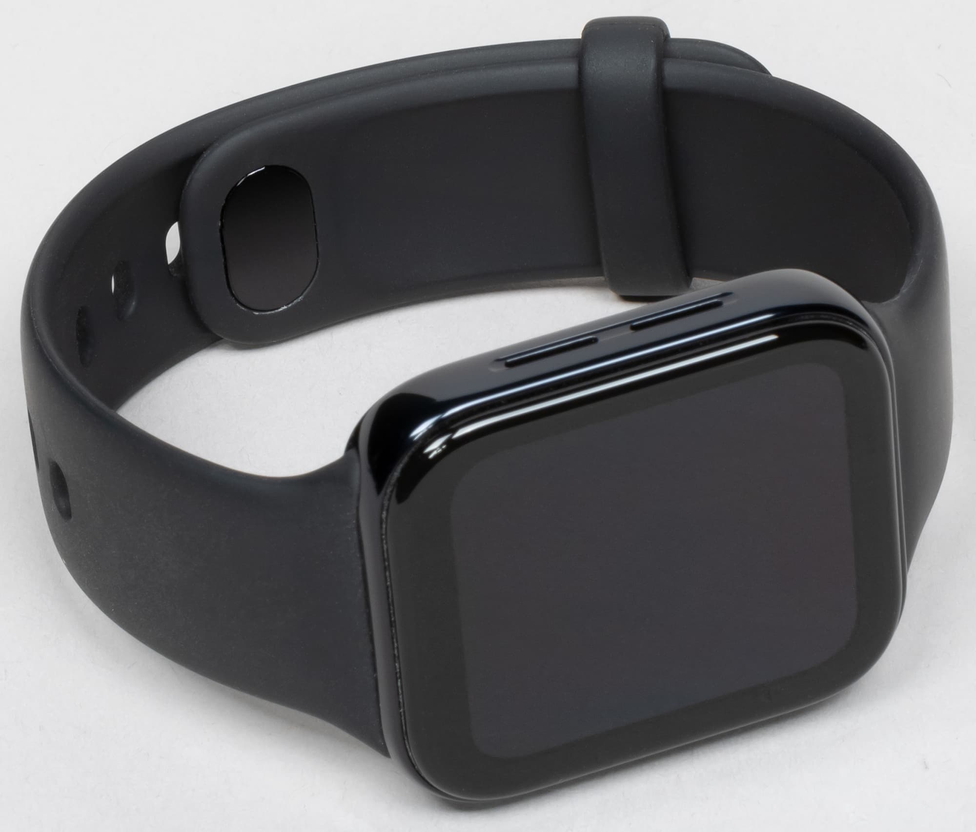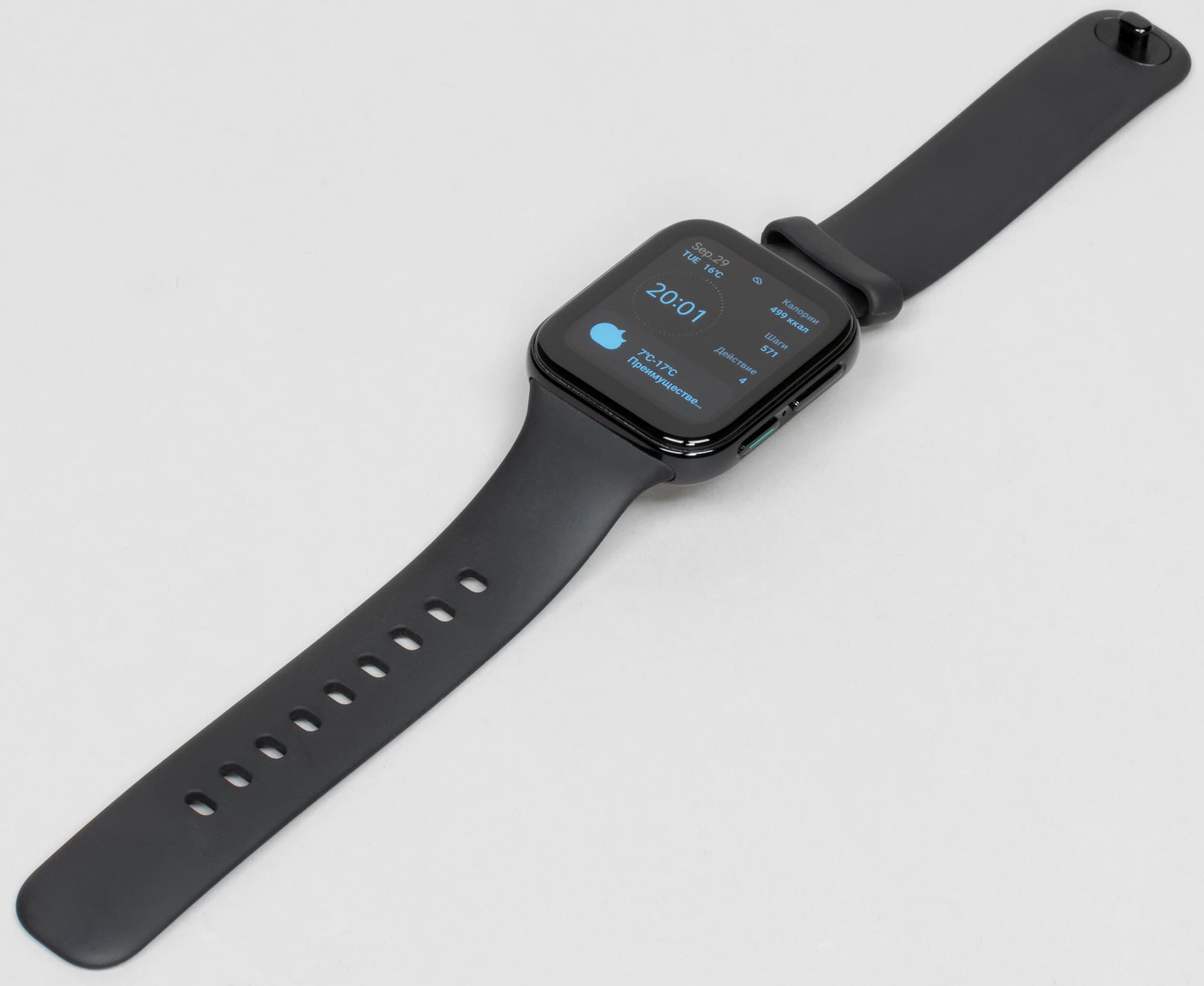 Обратим также внимание на обтекаемую форму корпуса, что благодаря глянцевой черной поверхности выглядит весьма эффектно. Производитель подчеркивает, что здесь используется изогнутый экран, однако в реальности можно говорить лишь о скруглении краев стекла. Рабочая часть дисплея — плоская. Рамки вокруг экрана довольно маленькие, но не сказать что рекордные. У Apple Watch последних поколений они примерно такие же.