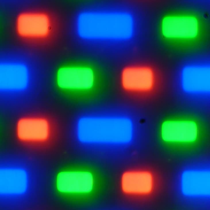 В этом экране используется OLED-матрица — активная матрица на органических светодиодах. Полноцветное изображение создается с помощью субпикселей трех цветов — красного (R), зеленого (G) и синего (B) в равном количестве, что подтверждается фрагментом микрофотографии: