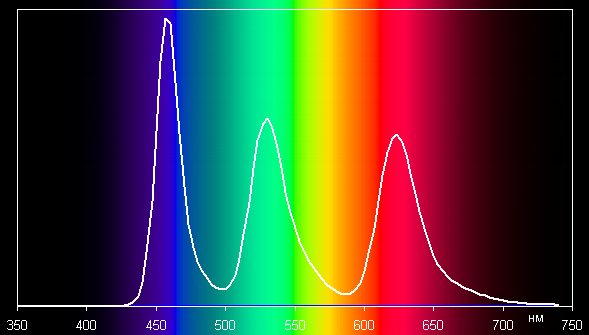 Спектр белого типичен для OLED — области первичных цветов хорошо разделены и имеют вид относительно узких пиков: