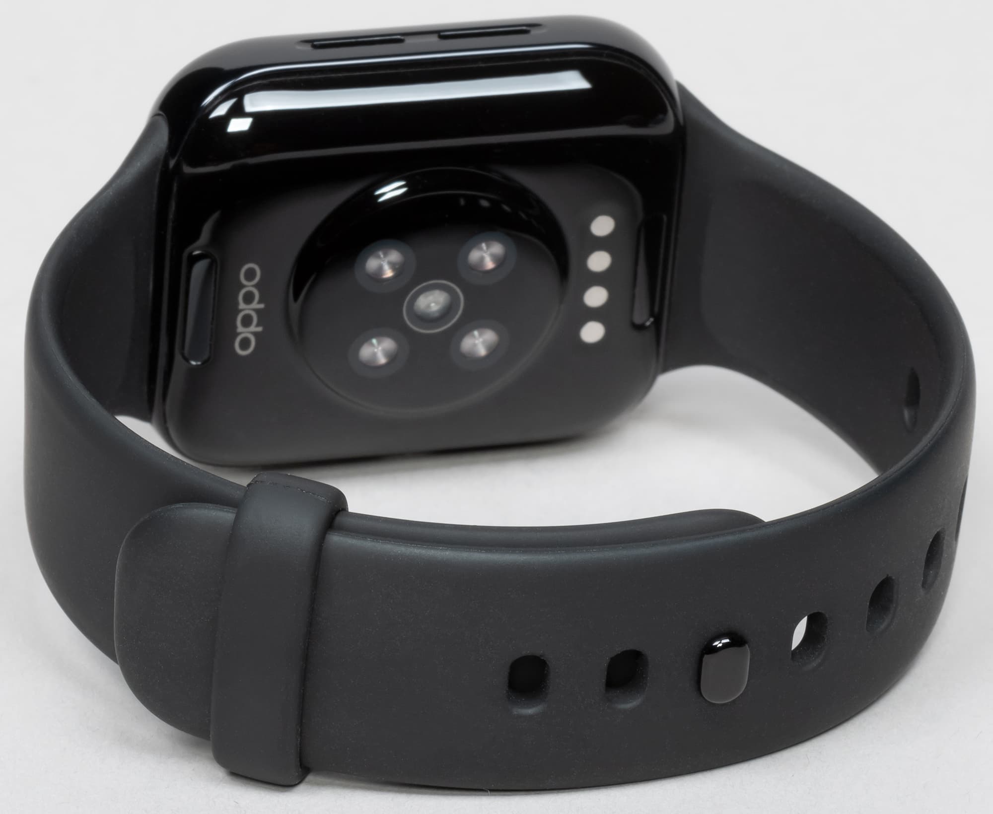 Часы во всех вариантах комплектуются только силиконовым ремешком. Правда, при заказе на сайте Oppo вы можете выбрать цвет — черный или золотой. У нас был черный. Он действительно черный, без какого-либо оттенка. Сам материал на ощупь приятный, очень похожий на тот, что использует Apple в силиконовых ремешках. Застежка выполнена из металла и весьма удобна. А большое количество отверстий позволяют плотно зафиксировать часы на руке любой толщины.
