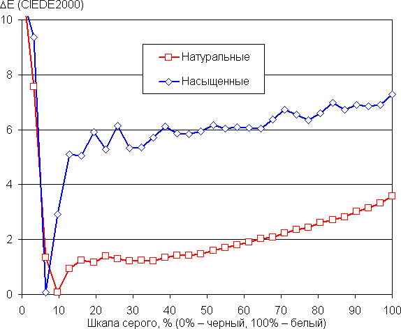 Баланс оттенков на шкале серого компромиссный, так как в случае профиля Натуральные цветовая температура существенно выше стандартных 6500 К, но отклонение от спектра абсолютно черного тела (ΔE) относительно невысокое, тогда как в случае профиля Насыщенные цветовая температура пониже, но ΔE выше. Впрочем в обоих случаях цветовая температура и ΔE мало изменяются от оттенка к оттенку — это положительно сказывается на визуальной оценке цветового баланса. (Самые темные области шкалы серого можно не учитывать, так как там баланс цветов не имеет большого значения, да и погрешность измерений цветовых характеристик на низкой яркости большая.)