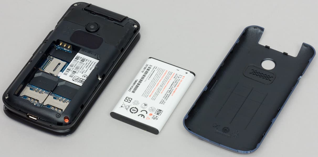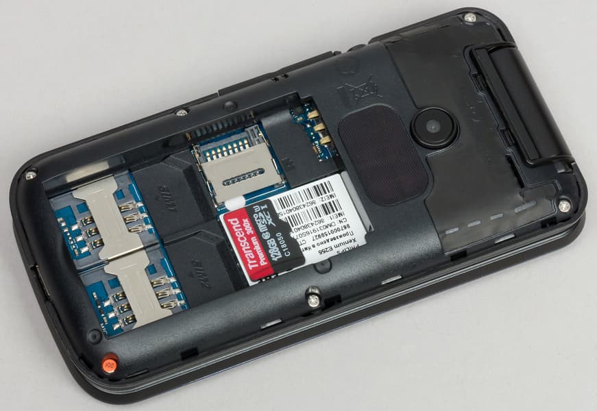 Под крышкой расположены посадочное место для аккумулятора, разъем для microSD-карты и два слота для SIM-карт формата Mini-SIM. Если кто-то забыл — существовал давным-давно такой формат SIM-карт, после него стали выпускать Micro-SIM, а потом, тоже давно, перешли на Nano-SIM. Покупая же новую SIM-карту для этого телефона, ее нужно выломать по самому большому контуру из трех.