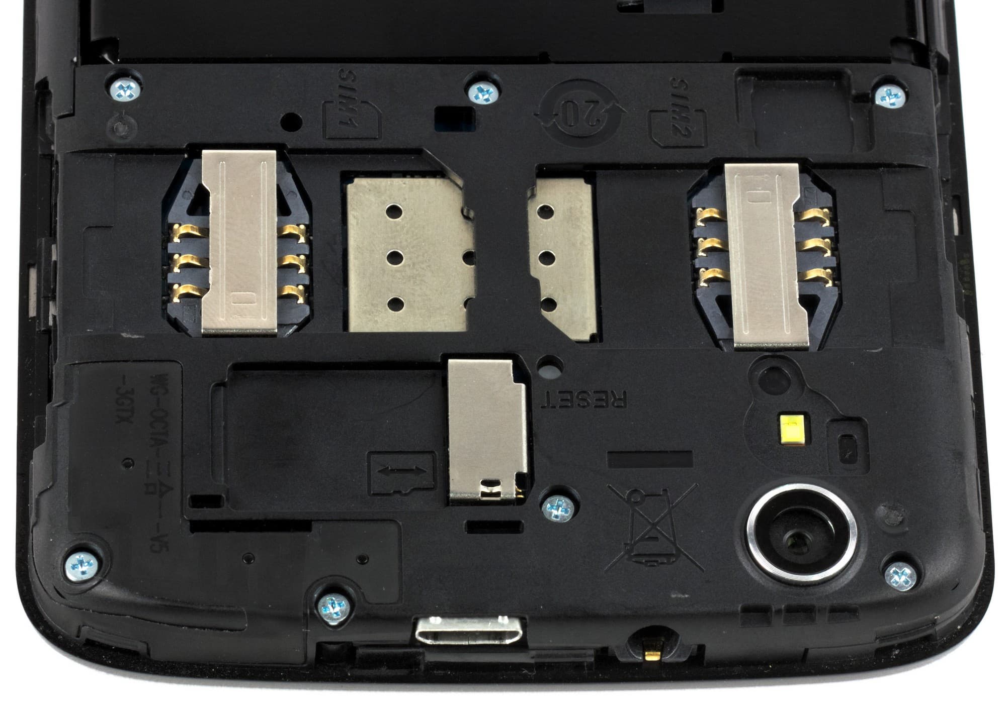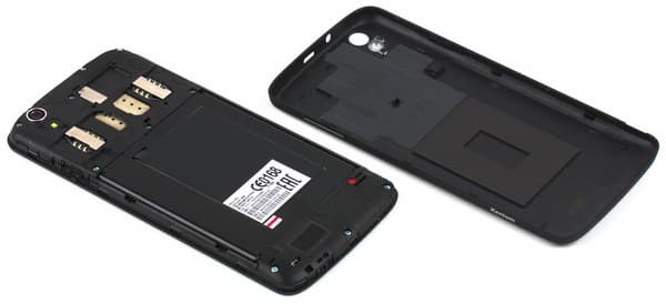 Задняя пластиковая крышка традиционно крепится на нескольких защелках и достаточно легко снимается с корпуса — для этого сбоку имеется небольшой уступ для ногтя. Под крышкой можно обнаружить стандартный комплект слотов: два — для Mini-SIM, а третий — для карты памяти microSD. Батарея здесь несъемная, она наглухо закрыта металлическим кожухом и недоступна для пользователя. Обе SIM-карты вставляются в свои слоты с боков и могут быть заменены даже без необходимости перезагрузки аппарата.