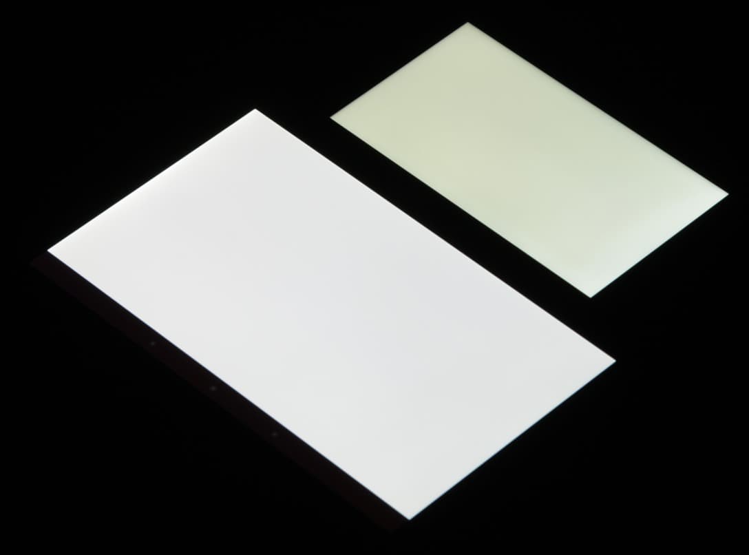 Экран имеет хорошие углы обзора без значительного сдвига цветов даже при больших отклонениях взгляда от перпендикуляра к экрану и без инвертирования оттенков. Для сравнения приведем фотографии, на которых на экраны Philips Xenium I908 и Nexus 7 выведены одинаковые изображения, при этом яркость экранов изначально установлена примерно на 200 кд/м² (по белому полю во весь экран), а цветовой баланс на фотоаппарате принудительно переключен на 6500 К. Перпендикулярно к экранам белое поле: