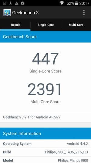 По результатам тестирования платформа показала весьма неплохие результаты, производительность у смартфона выше среднего (примерно 30К в AnTuTu v 5.x). Для сравнения: смартфон Fly Ego Art 2, функционирующий на точно такой же платформе, но с одним гигабайтом ОЗУ, продемонстрировал в той же версии бенчмарка примерно 22К очков. Что же касается конкурирующих платформ, то свежая восьмиядерная SoC Huawei под названием HiSilicon Kirin 920, установленная в Huawei Honor 6, показывает в этом же тесте гораздо более высокие результаты (примерно 41К). И если учесть, что результаты наших проверок установили схожесть результатов этой новой платформы с топовой Qualcomm Snapdragon 801, то следовательно, герой обзора с точно таким же большим отрывам уступит и ей. Это, в первую очередь, связано с тем, что у более производительных платформ в качестве основных используются продвинутые ядра Krait 400/Cortex-A15. Тем не менее, описываемый сегодня смартфон достаточно мощный, производительности восьмиядерной платформы еще долго будет хватать для выполнения большинства задач.