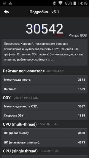 Литий-ионная батарея, установленная в Philips Xenium I908, имеет гораздо большую, чем у конкурирующих решений на той же платформе, емкость в 3000 мА·ч. И тем не менее, смартфон по итогам тестирования не продемонстрировал рекордов в автономности. Каких-либо специфических фирменных энергосберегающих режимов, как можно было бы ожидать от Xenium, в смартфоне нет. Нашелся лишь один стандартный энергосберегающий режим, который всегда присутствует во всех прошивках смартфонов на данной SoC MTK и который всегда по умолчанию включен — иначе уровень заряда этих восьмиядерных аппаратов улетучивается на глазах. Это, кстати, тот исключительный случай, когда нам приходится тестировать аппараты с применением режима энергосбережения, в случае любых других платформ мы выключаем какие бы то ни было экономящие энергию функции. Еще один любопытный момент связан с тем, что в официальных спецификациях смартфона указано применение литий-полимерного аккумулятора, но CPU-Z идентифицировал его батарею как литий-ионную.