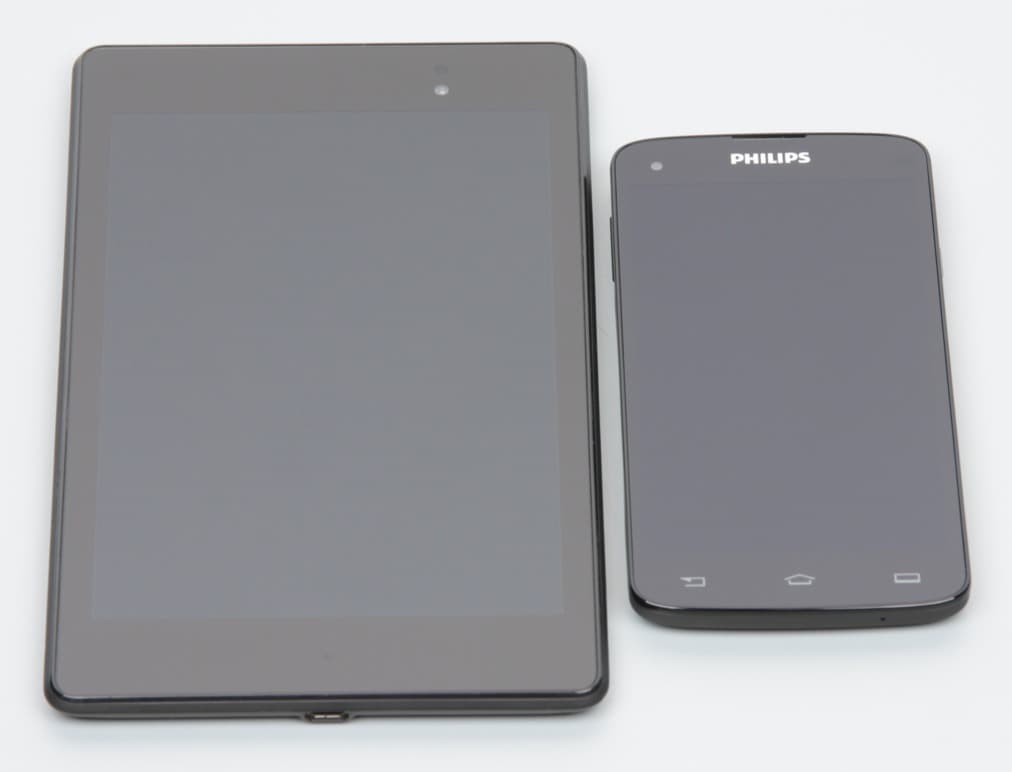 Лицевая поверхность экрана выполнена в виде стеклянной пластины с зеркально-гладкой поверхностью, устойчивой к появлению царапин. Судя по отражению объектов антибликовые свойства экрана не хуже, чем у экрана Google Nexus 7 (2013) (далее просто Nexus 7). Для наглядности приведем фотографию, на которой в выключенных экранах отражается белая поверхность (слева — Nexus 7, справа — Philips Xenium I908, далее их можно различать по размеру):