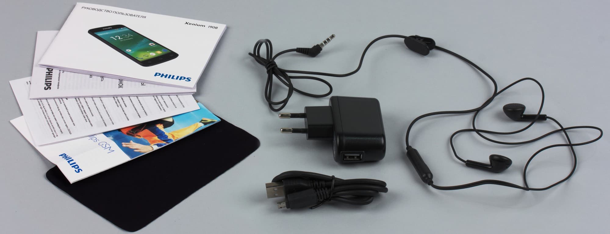 Комплект аксессуаров состоит из компактного зарядного устройства (выходной ток 1 А), соединительного кабеля Micro-USB, простенькой проводной стереогарнитуры с тонким проводом круглого сечения без вакуумных амбушюр, а также защитной пленки на экран и нескольких книжиц бумажной документации.