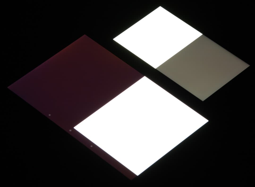 Яркость под углом у экранов уменьшилась (как минимум в 5 раз, исходя из разницы в выдержке), но в случае Philips Xenium I908 падение яркости чуть больше. Черное поле при отклонении по диагонали высветляется сильно, но остается примерно нейтрально-серым. Фотографии ниже это демонстрируют (яркость белых участков в перпендикулярном плоскости экранов направлении примерно одинаковая!):