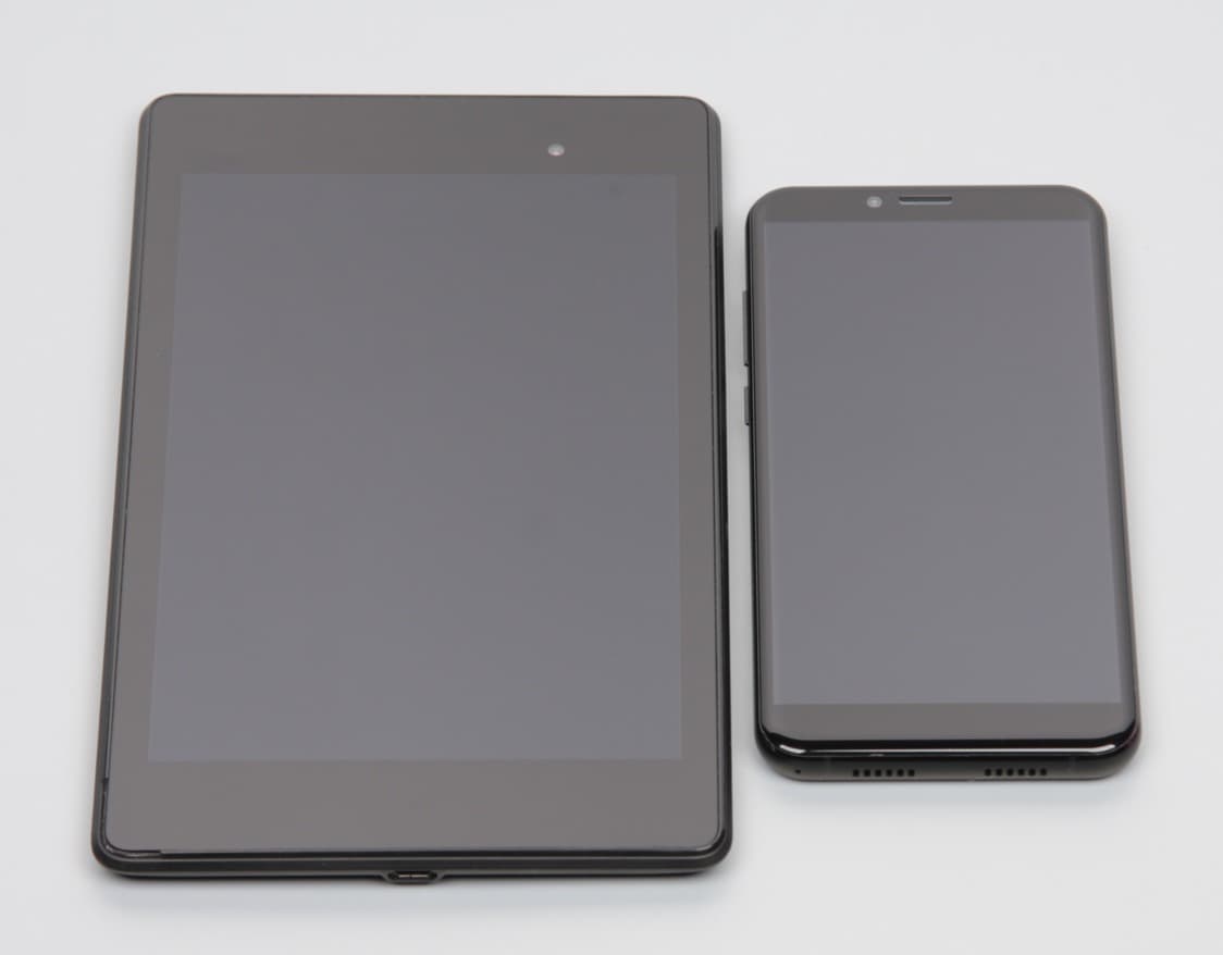 Лицевая поверхность экрана выполнена в виде стеклянной пластины с зеркально-гладкой поверхностью, устойчивой к появлению царапин. Судя по отражению объектов, антибликовые свойства экрана не хуже, чем у экрана Google Nexus 7 (2013) (далее просто Nexus 7). Для наглядности приведем фотографию, на которой в выключенных экранах отражается белая поверхность (слева — Nexus 7, справа — Pixelphone M1, далее их можно различать по размеру):