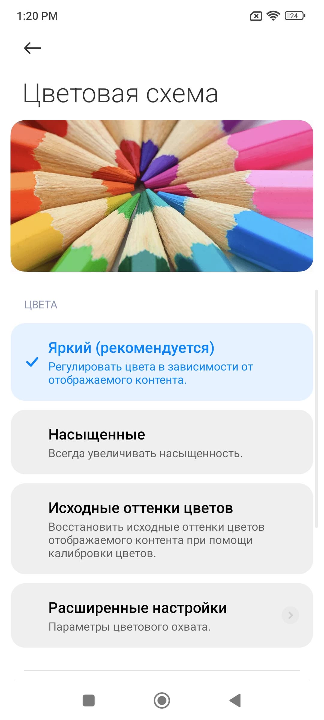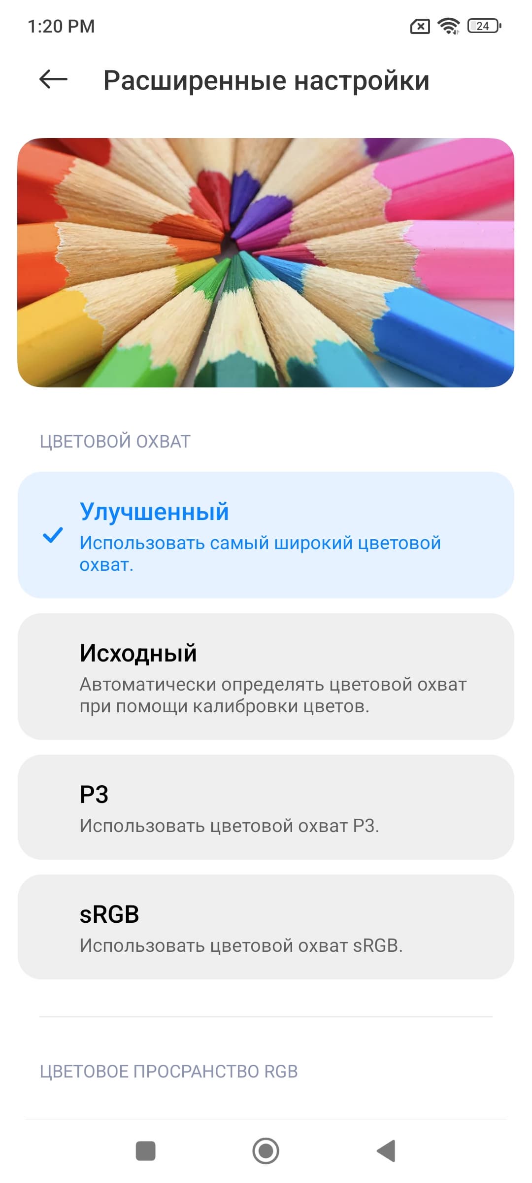 Фотография выше получена для профиля Яркий в настройках экрана. Базовых профилей три, а в четвертом можно вручную выбирать коррекцию цветового охвата, менять цветовой баланс многочисленными настройками и т.д: